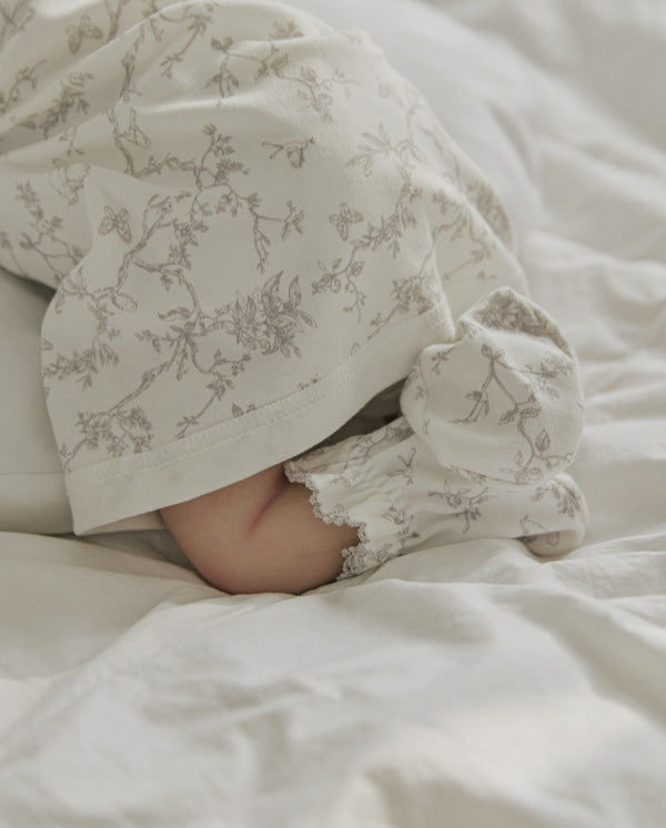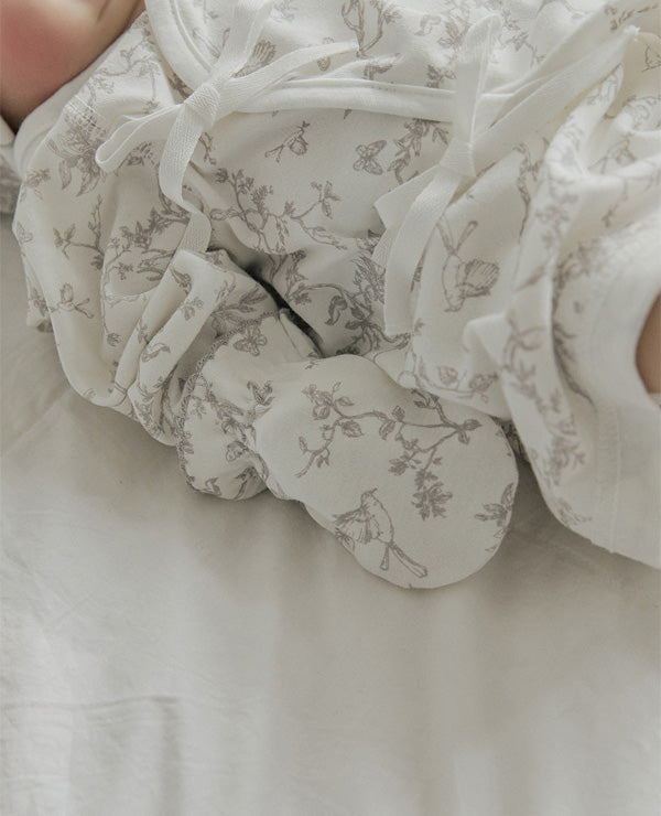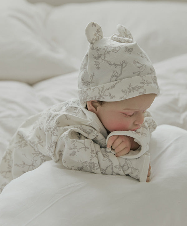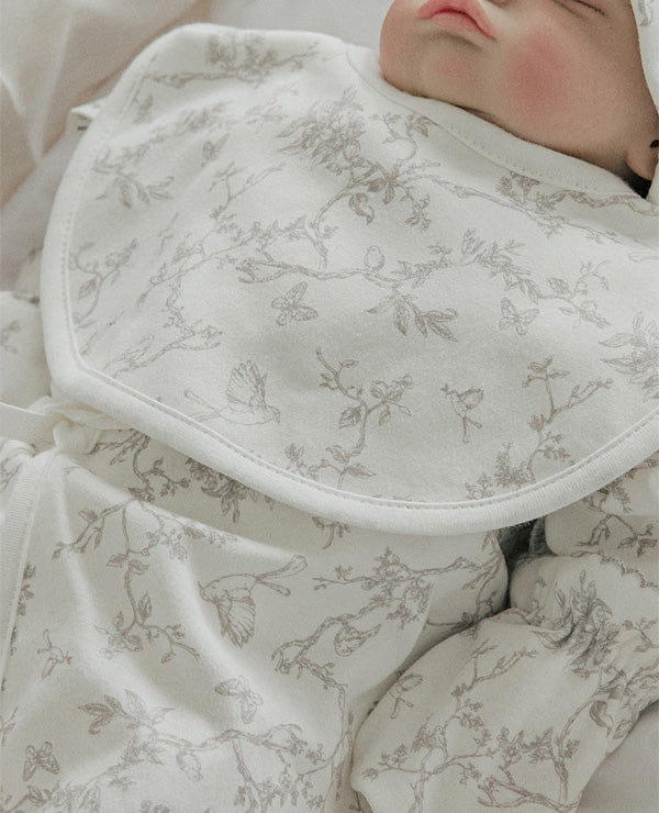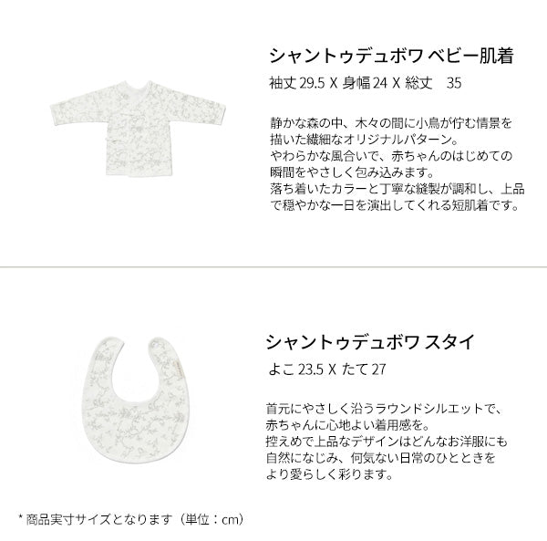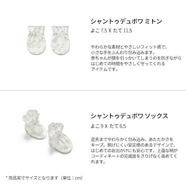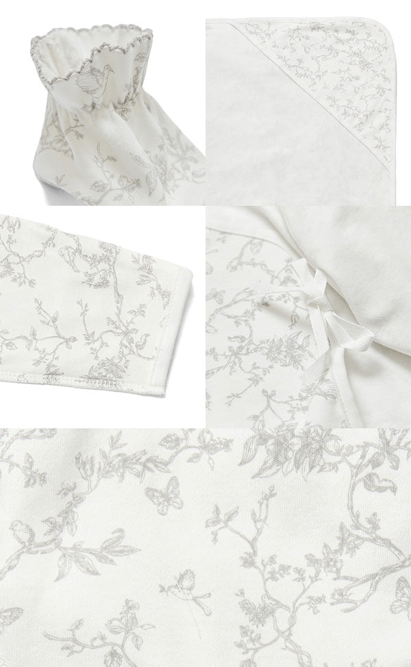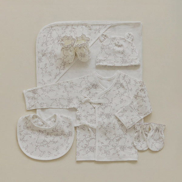 オリジナルパターンで仕立てた上質なファブリックを使用し、肌に触れるたびに優しい気持ちになれる新生児用6点セットです。