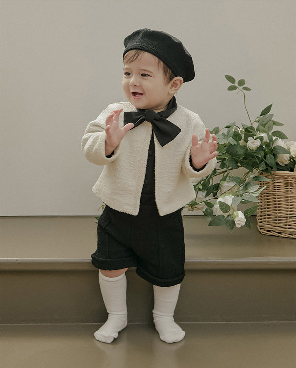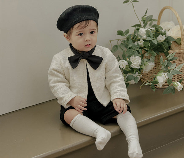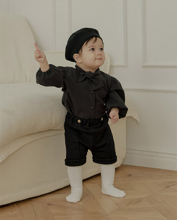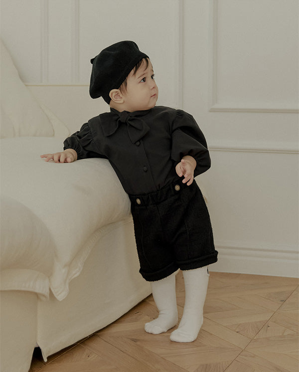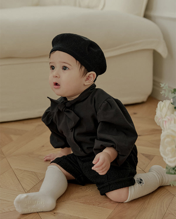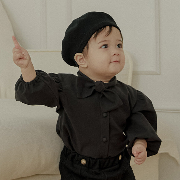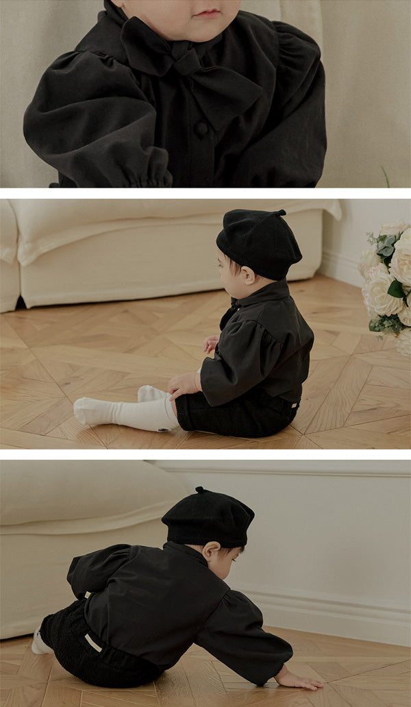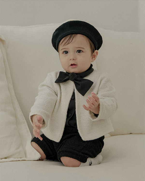 首元にあしらわれたボウタイは自然に形が整い、アクセサリーなしでもコーディネートが完成するデザインで、フォーマルなシーンでも印象的な佇まいを演出します。