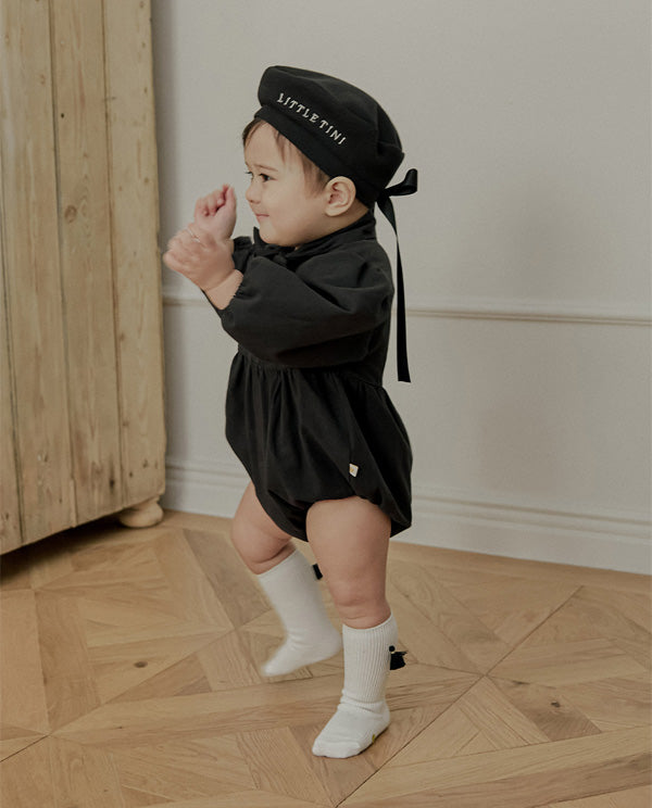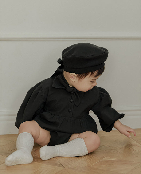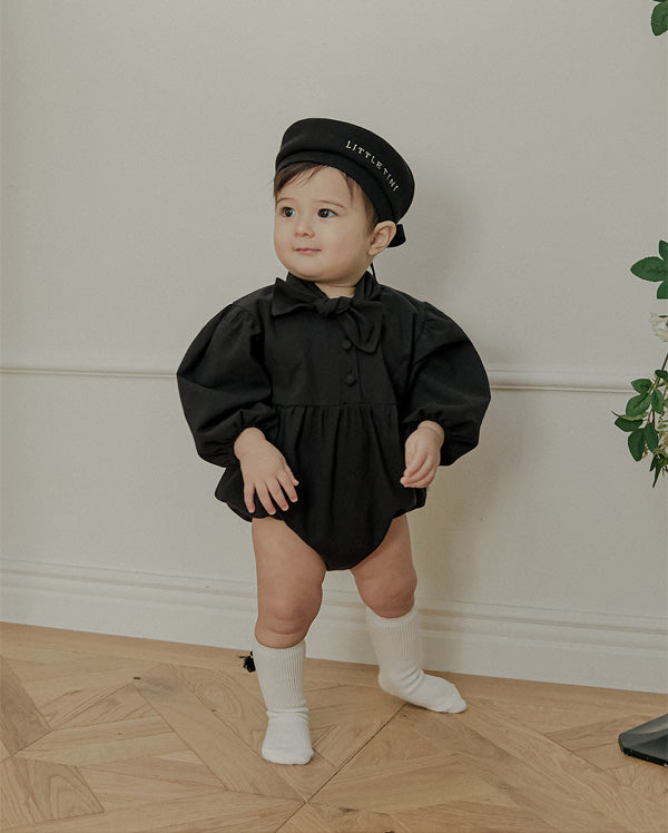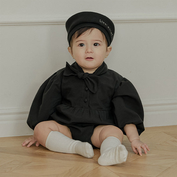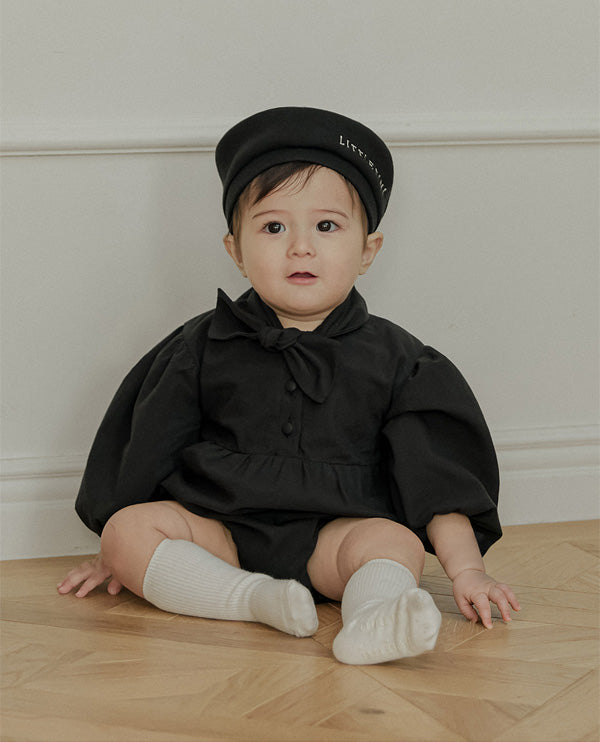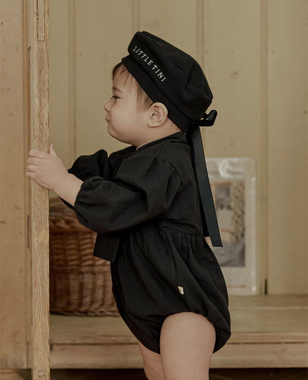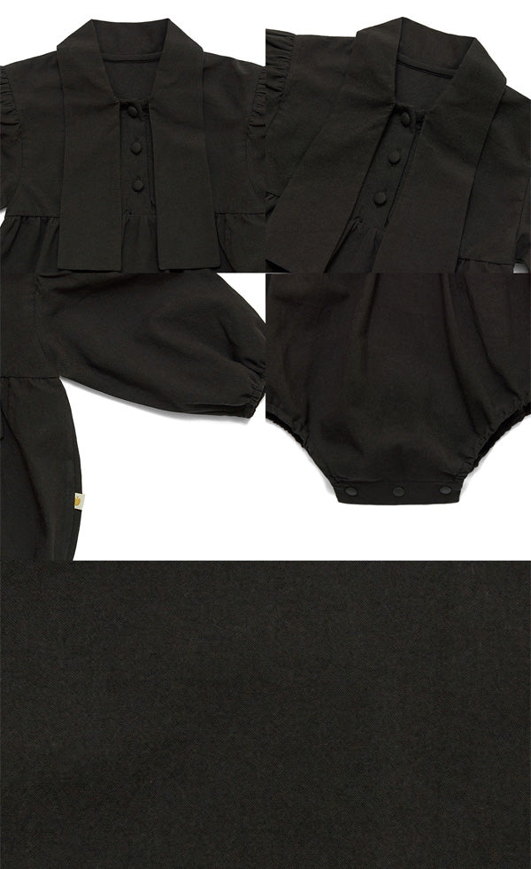 一枚で洗練されたフォーマルスタイルが完成する、ブラックのタイロンパース。すっきりとしたボディスーツシルエットにタイディテールを固定し、ネクタイいらずで整った印象を演出します。結んだり外したりする装飾ではなく、常に美しいバランスを保つ構築的なデザインが特徴で、フォーマルな中にも愛らしさをプラスします。写真撮影やセレモニーでも主役級の存在感を放つ一枚です。