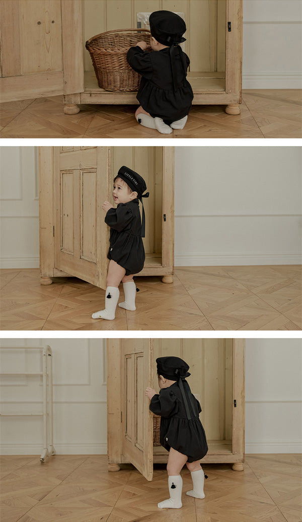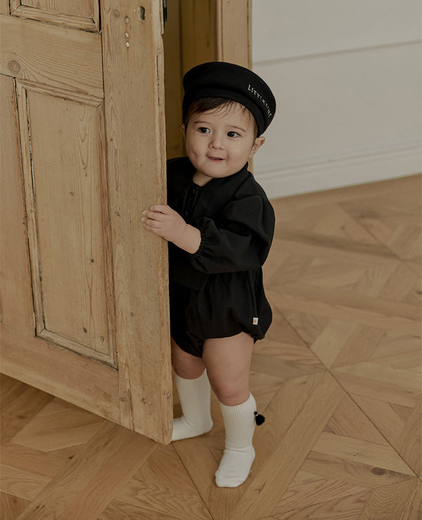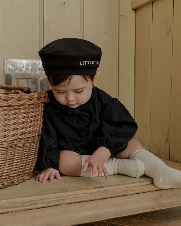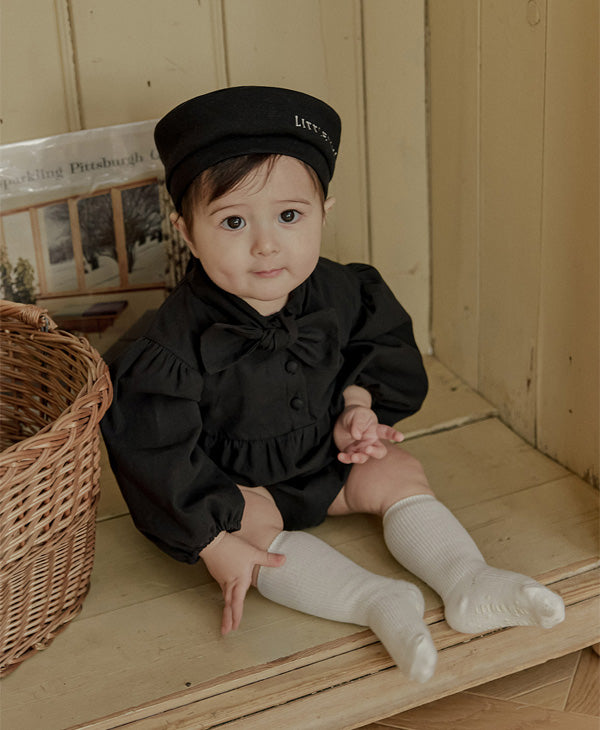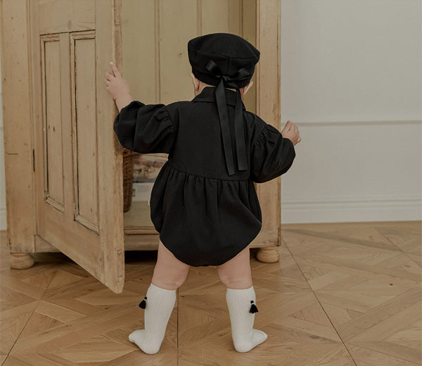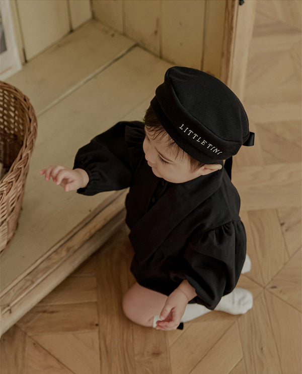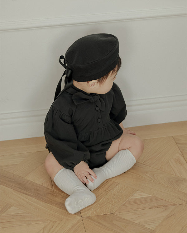 一枚で洗練されたフォーマルスタイルが完成する、ブラックのタイロンパース。すっきりとしたボディスーツシルエットにタイディテールを固定し、ネクタイいらずで整った印象を演出します。結んだり外したりする装飾ではなく、常に美しいバランスを保つ構築的なデザインが特徴で、フォーマルな中にも愛らしさをプラスします。写真撮影やセレモニーでも主役級の存在感を放つ一枚です。