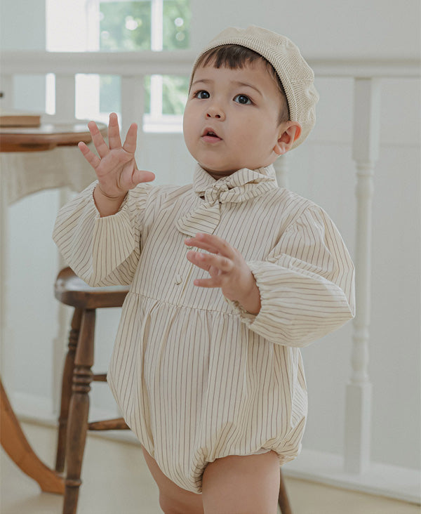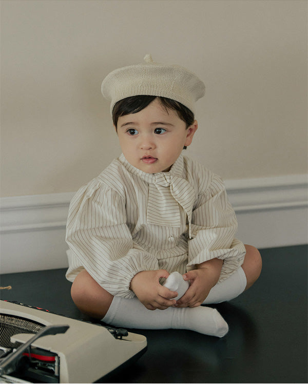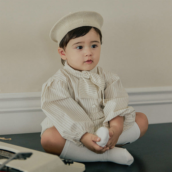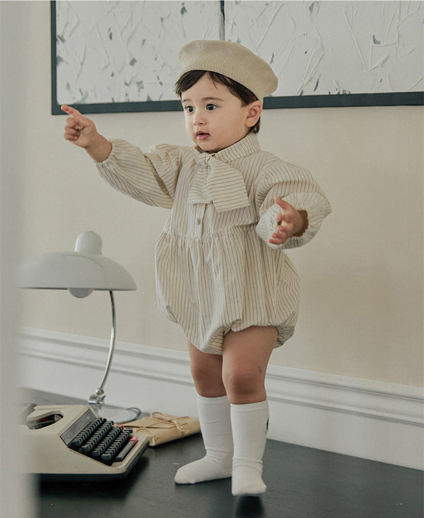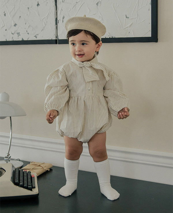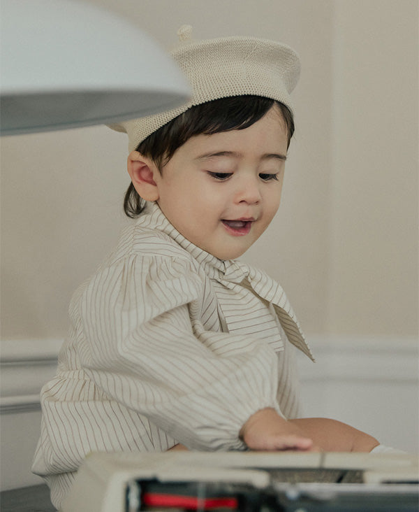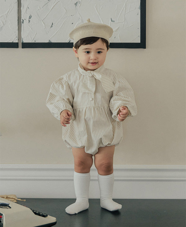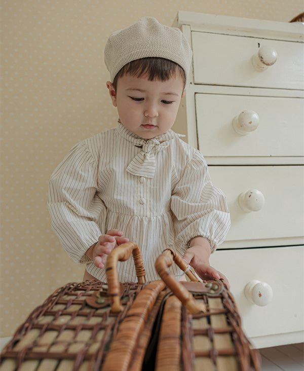やわらかなストライプ柄は上品で涼やかな印象を与え、ふんわりとしたパフスリーブが愛らしいシルエットをプラス。リボンの結び方ひとつで、クラシックにもナチュラルにも雰囲気を変えられる一着です。