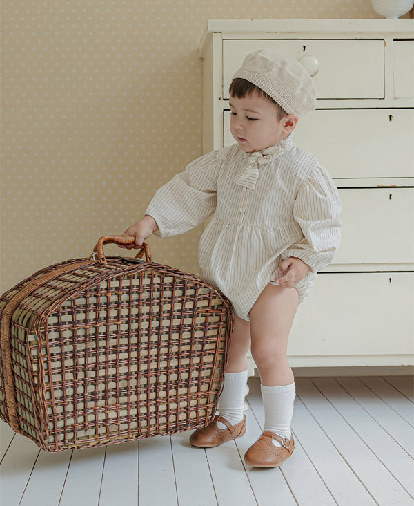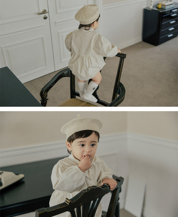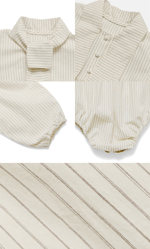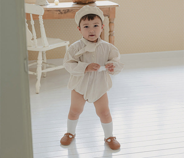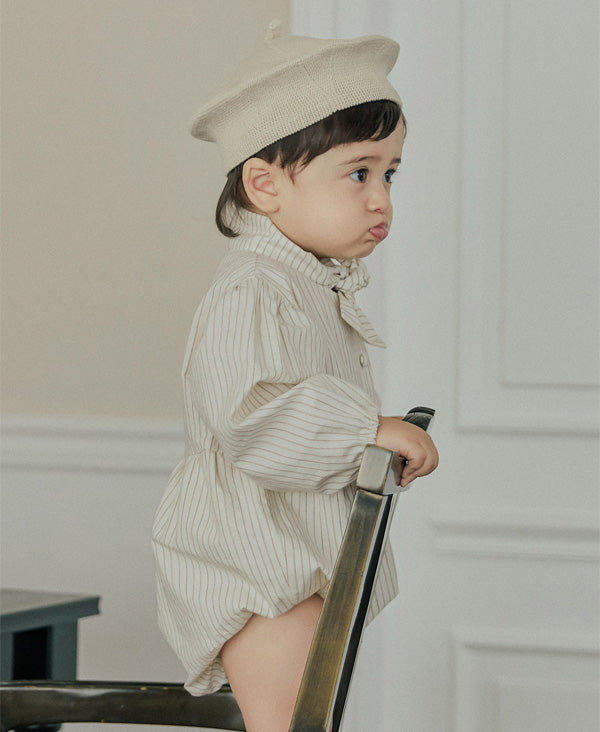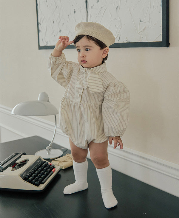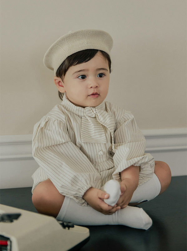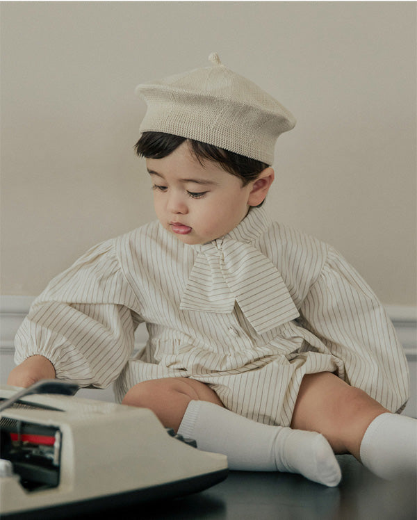 やわらかなストライプ柄は上品で涼やかな印象を与え、ふんわりとしたパフスリーブが愛らしいシルエットをプラス。リボンの結び方ひとつで、クラシックにもナチュラルにも雰囲気を変えられる一着です。