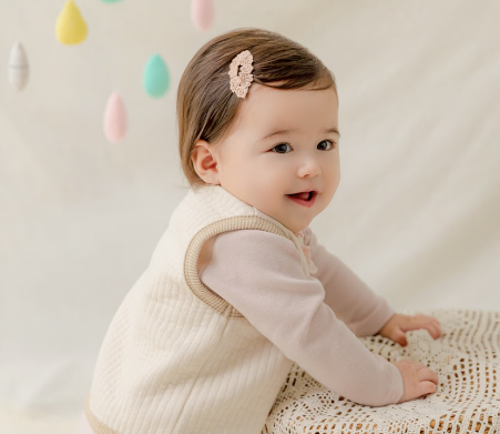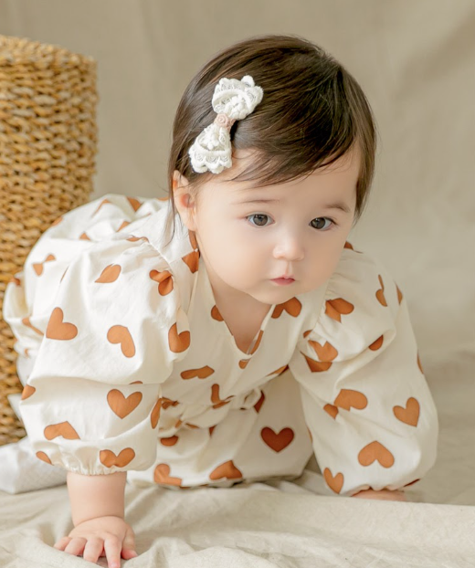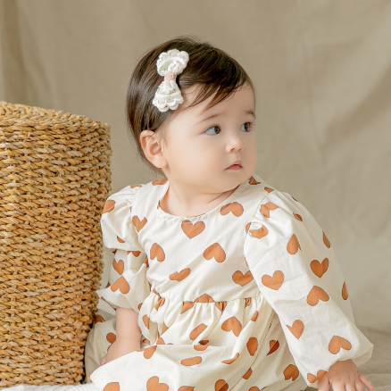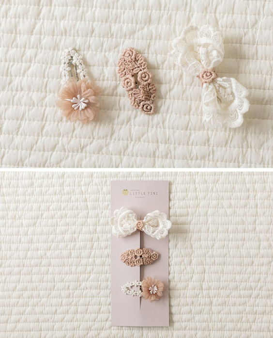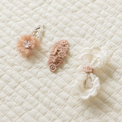 このボロニヘアピンセットには、ほんのりピンク色のお花がついています。赤ちゃんのかわいい髪をとめるのにぴったり。やさしい色と形で、お子様のヘアスタイルをより可愛らしく演出します。