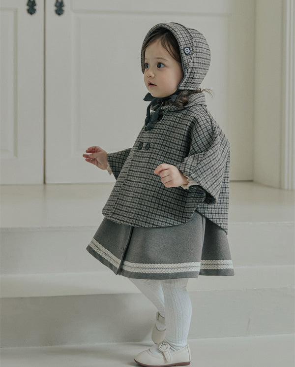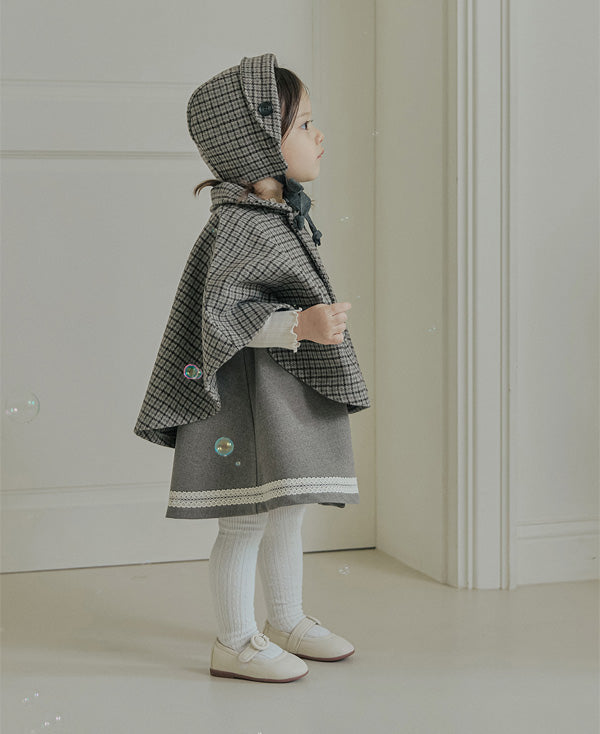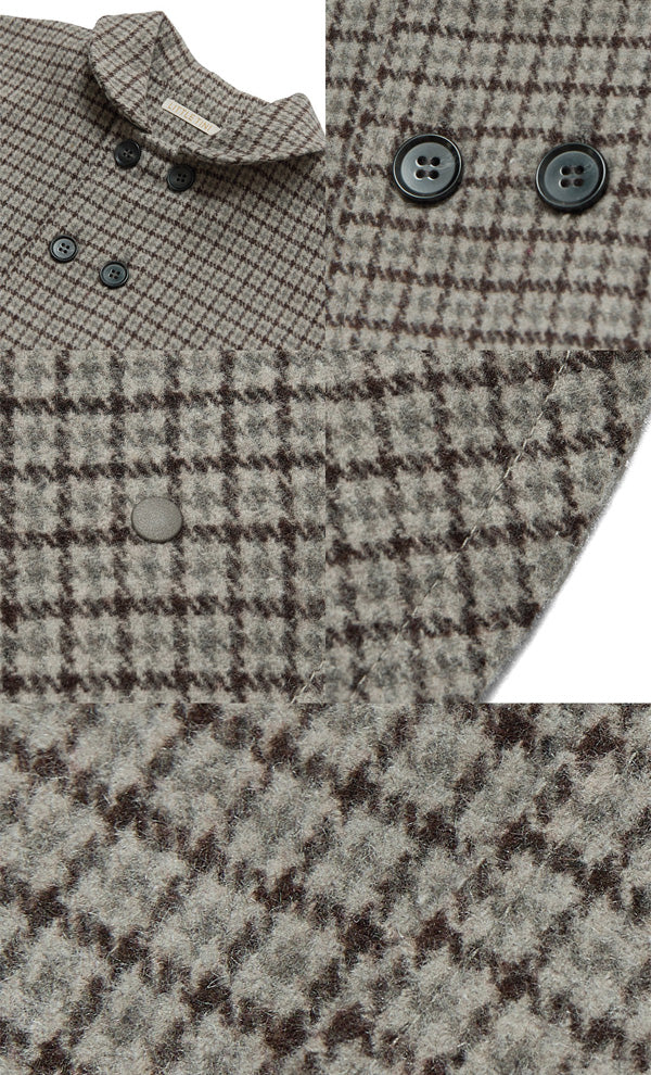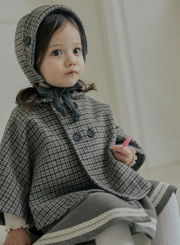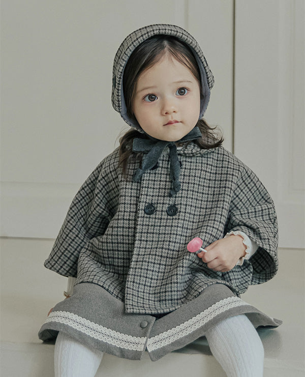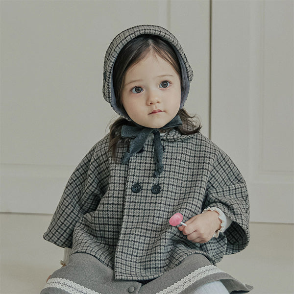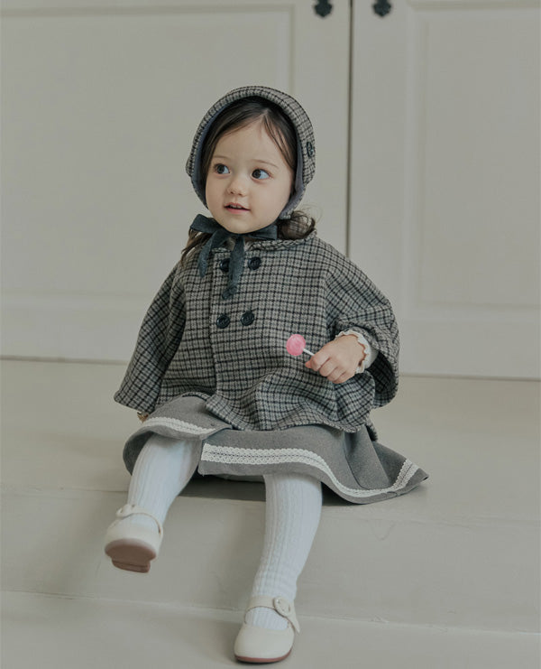 襟付きデザインがシルエットを引き締め、ダブルボタンのアクセントが安定感とクラシカルな印象をプラスします。同シリーズの「モンシェールハット」と合わせれば、まるで絵本のワンシーンのようなクラシックコーデが完成します。