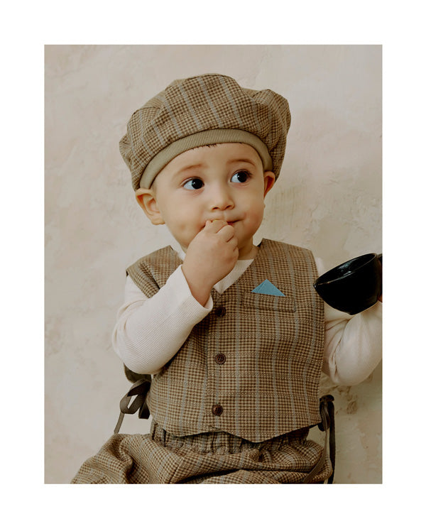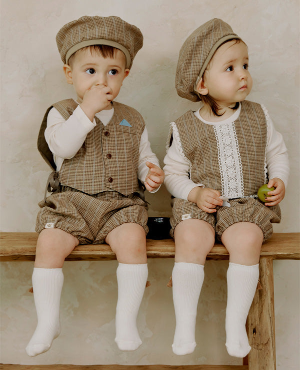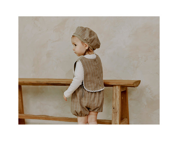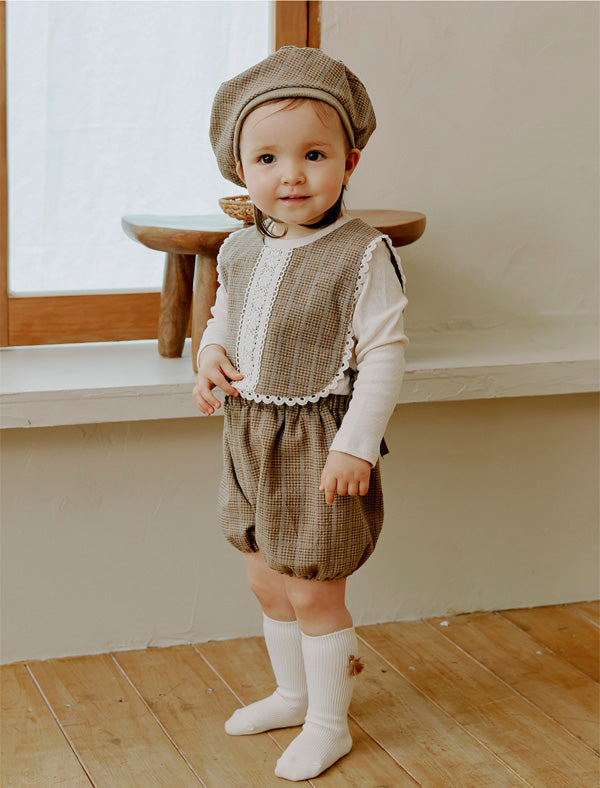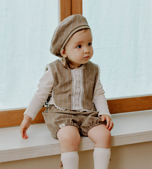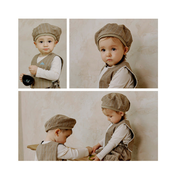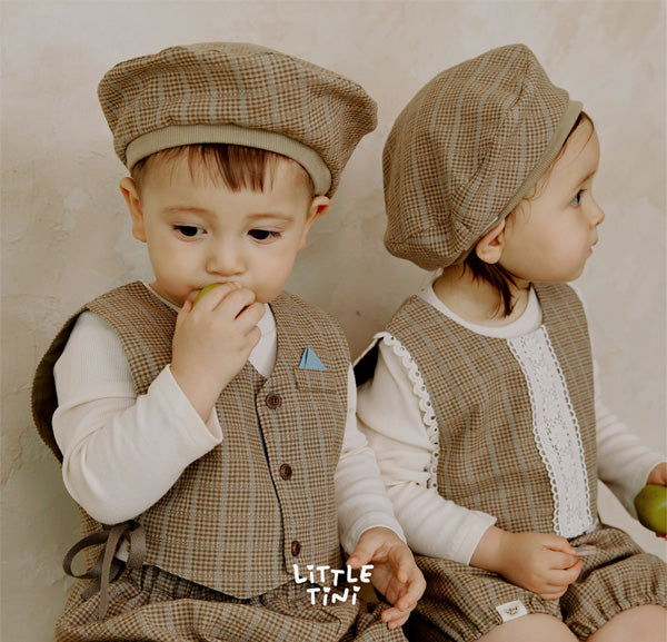 リトルティニのシグネチャーアイテムであるショートベストやブルマーとセットアップでコーディネートできるようデザインされたベレー帽です。