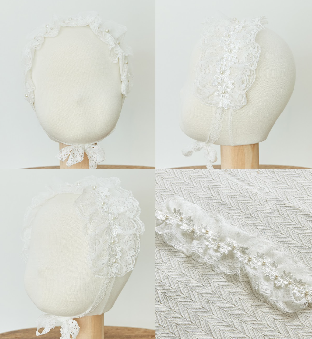 ロココボンネットは、面積が広くて目を引くレースが特徴です。色々なスタイルに合わせて、華やかでエレガントな雰囲気を演出します。子供の魅力を更に引き立てる、必須アイテムです。