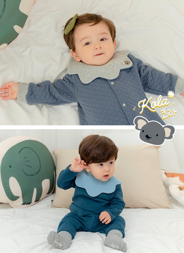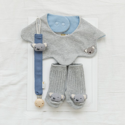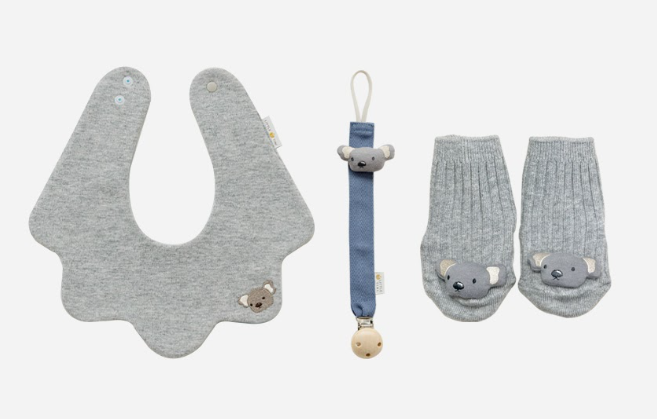 Coraスタイセットはストラップ付きの3点セット。グレーの子コアラの可愛いデザインで、よだれかけと靴下、おもちゃをかけることができます。