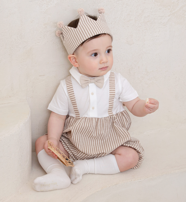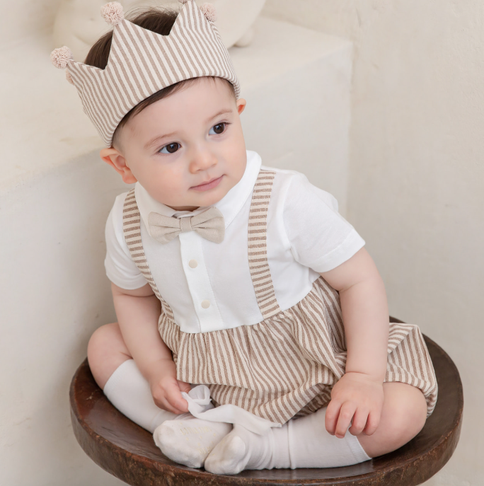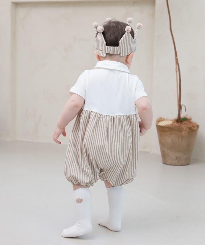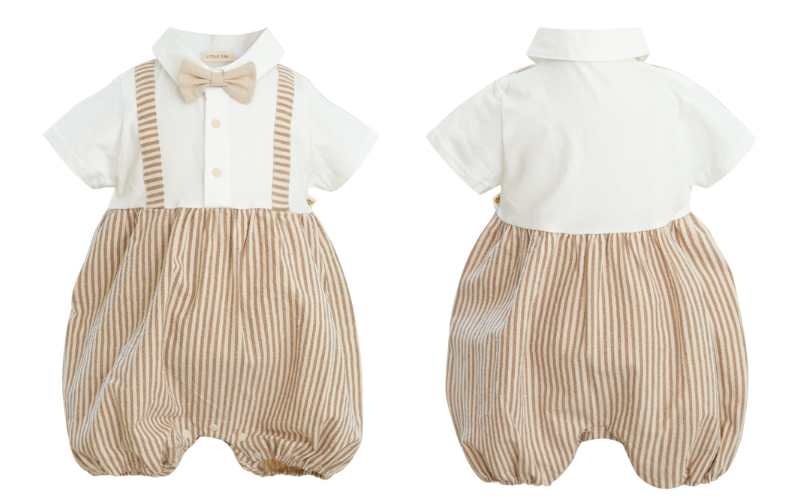 赤ちゃんのカッコ可愛さを引き立てる男の子用ロンパースです。ベージュストライプのパータンとスーツデザインがおしゃれで、地味ながらも強く印象に残るデザインです。どのシーンでも似合い、お子様にもママにもお楽しみいただけます。